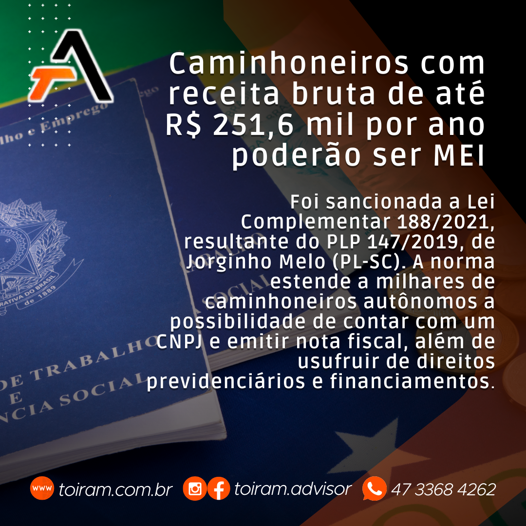Caminhoneiros com receita bruta de até R$ 251,6 mil por ano poderão ser MEI Foi sancionada a Lei Complementar 188/2021, resultante do PLP 147/2019, de Jorginho Melo (PL-SC).