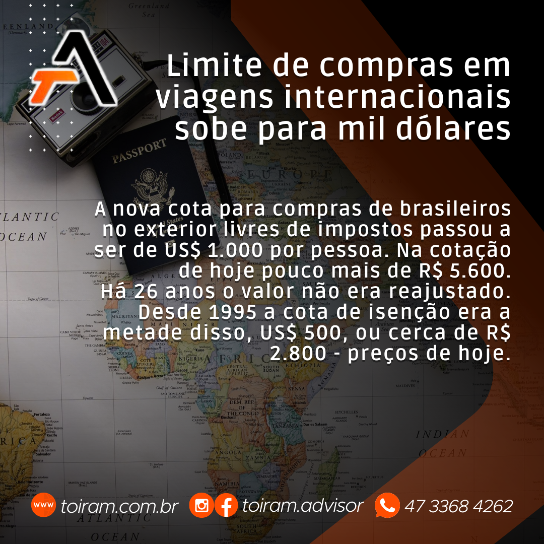 Há 26 anos o valor não era reajustado. Desde 1995 a cota de isenção era a metade disso, US$ 500, ou cerca de R$ 2.800 – preços de hoje.