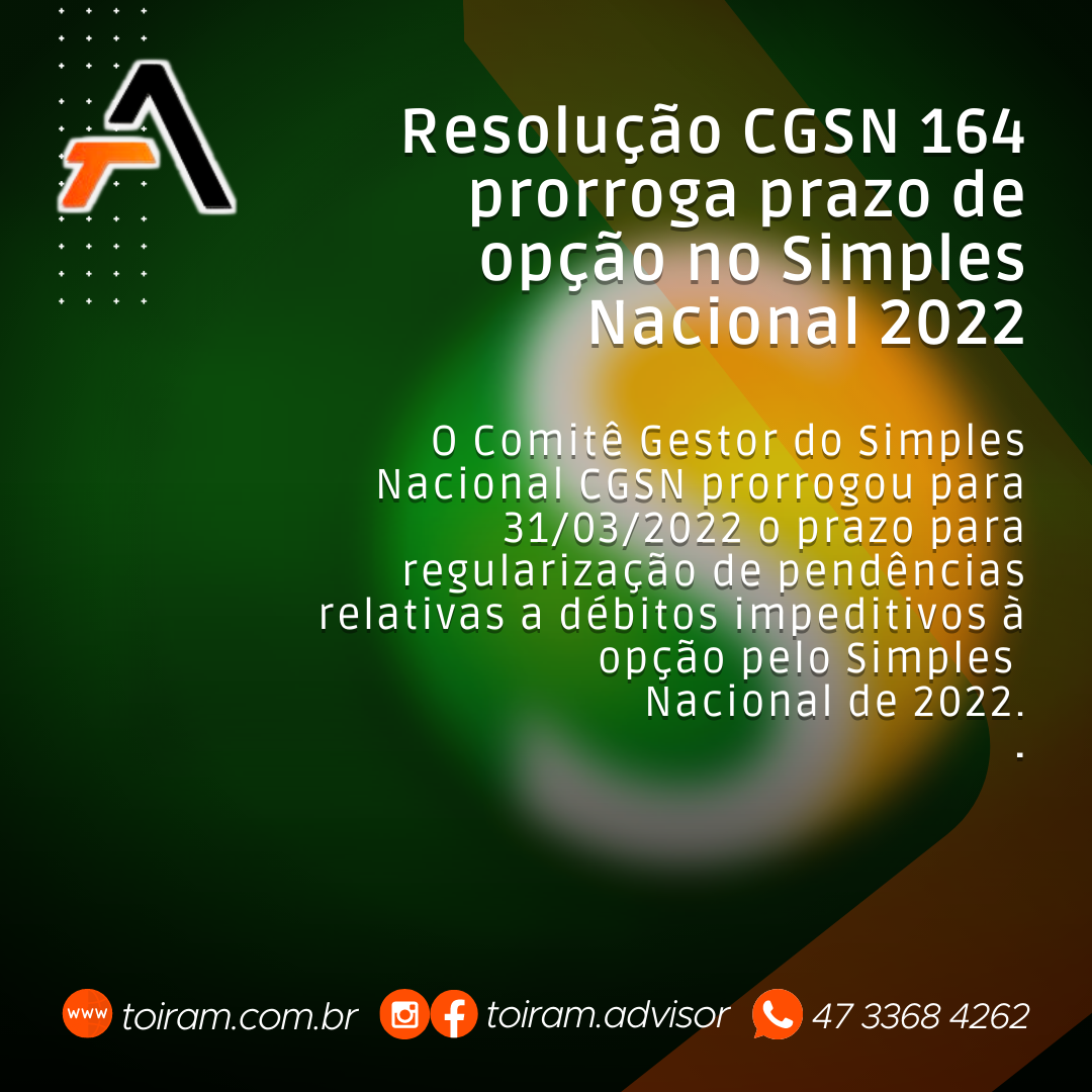 Resolução CGSN 164 prorroga prazo de opção no Simples Nacional 2022 O Comitê Gestor do Simples Nacional CGSN prorrogou para 31/03/2022 o prazo para regularização de pendências relativas a débitos impeditivos à opção pelo Simples Nacional de 2022.
