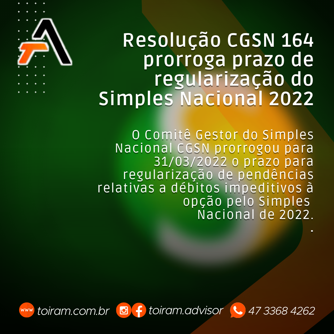 A Resolução CGSN nº 164 prorroga o prazo para regularizações de pendências relativas a débitos impeditivos à Simples Nacional realizadas até 31 de março de 2022. Ressalta-se que o prazo para opção pelo regime especial simplificado permanece em 31 de janeiro de 2022, visto que este é fixado pela Lei Complementar 123/2006.
